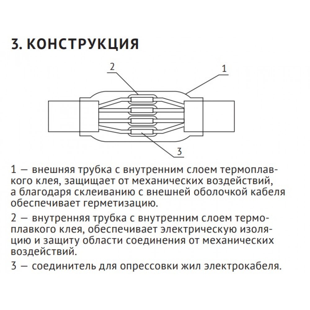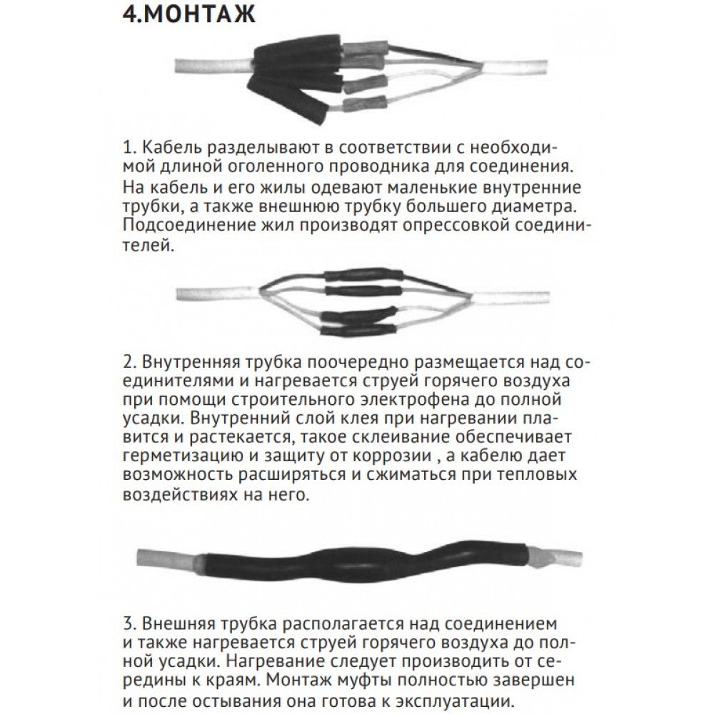 Внешняя и внутренняя трубки с внутренним слоем термоплавкого клея обеспечивают надежную электрическую изоляцию и защиту области соединения от механических воздействий. Количество жил в соединяемых кабеля - не более четырех.
